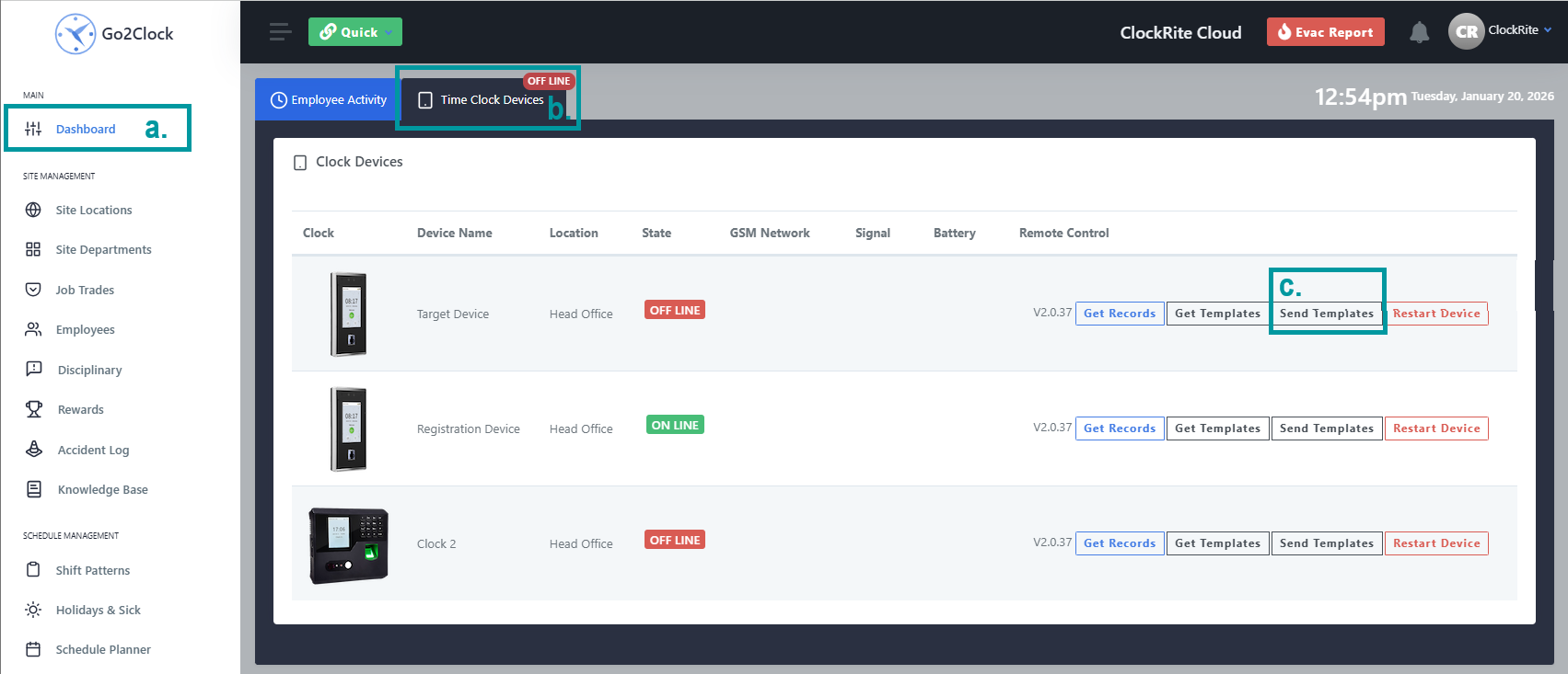 - Under Main select Dashboard(a) and then navigate to Time Clock Devices(b).