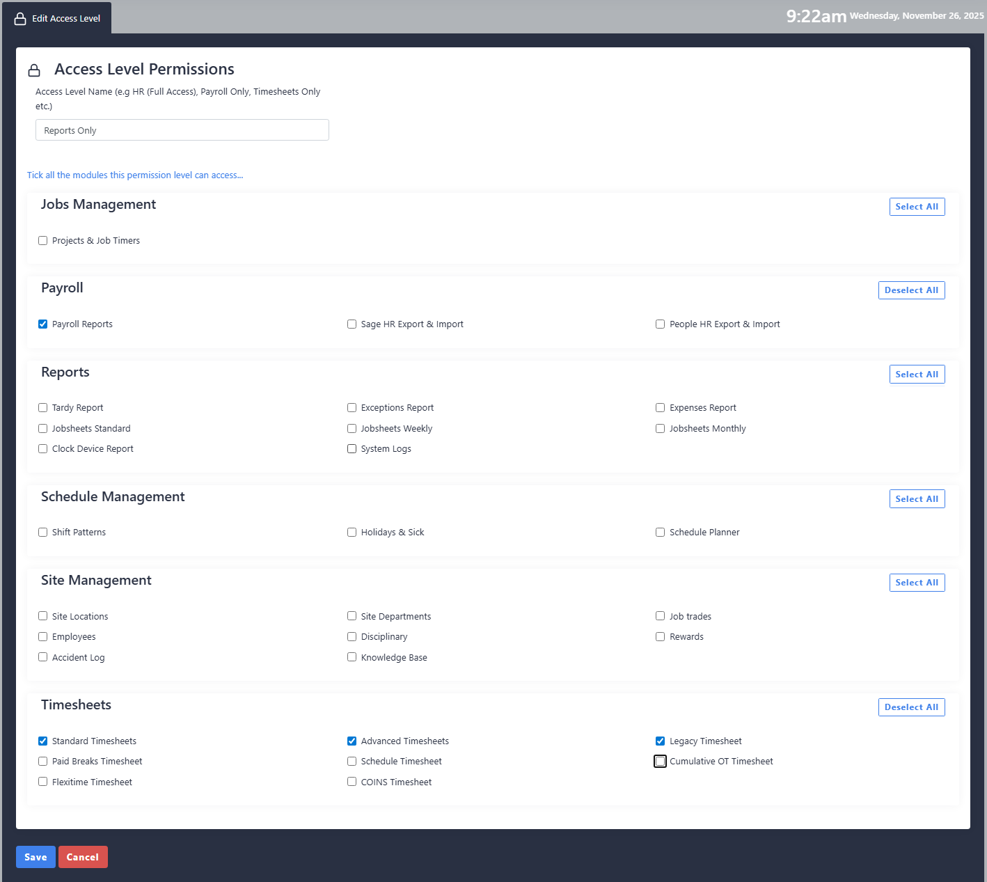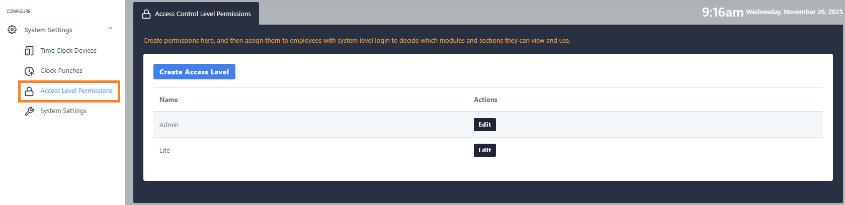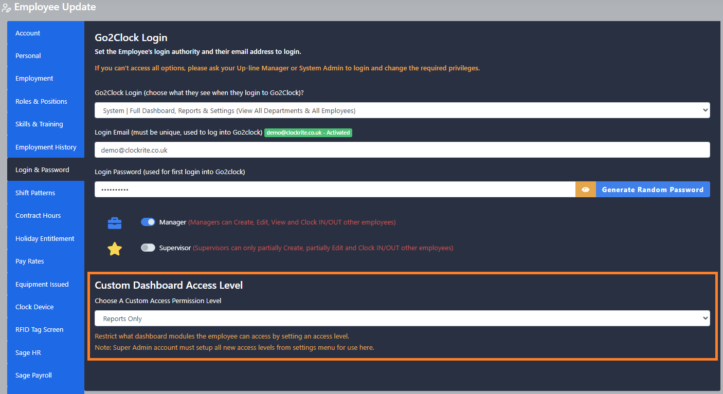 Access Level Permissions - System users can now have access limited to specific modules. The super admin can create different access levels which can then be assigned to the user logins.
