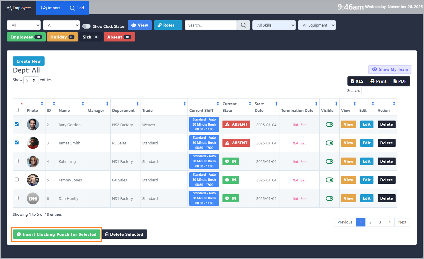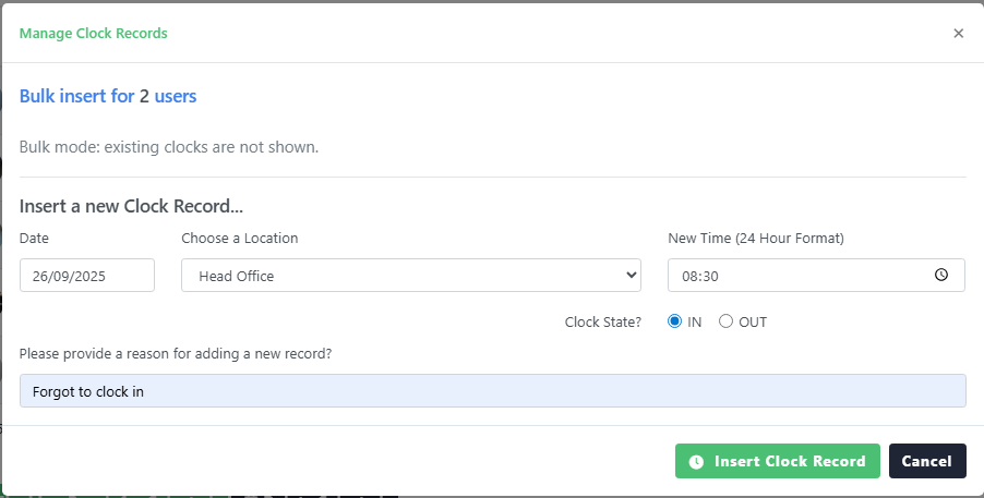 Bulk Actions - You can now insert clockings for multiple employees at one from within the employees module.