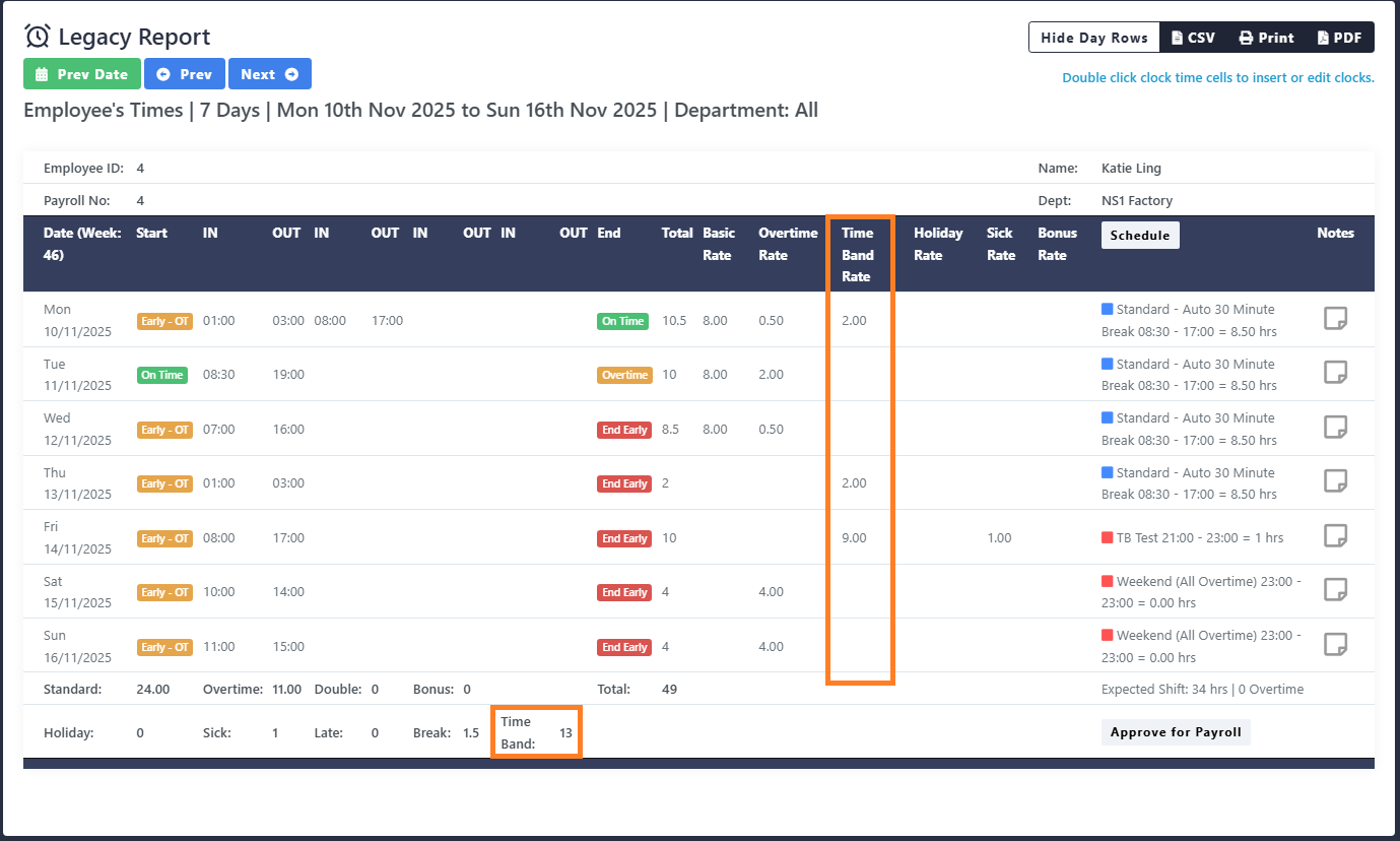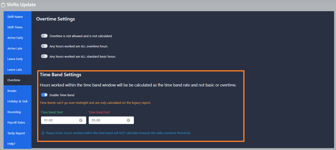 Time Band Support - Legacy Timesheet V6 onwards has been updated to support a time band. The time band is applied within the shift setup. Any hours worked within the time band are not attributed to basic or overtime and are instead calculated at their own rate of pay. Hours worked within the time band also do not contribute towards the daily overtime threshold.