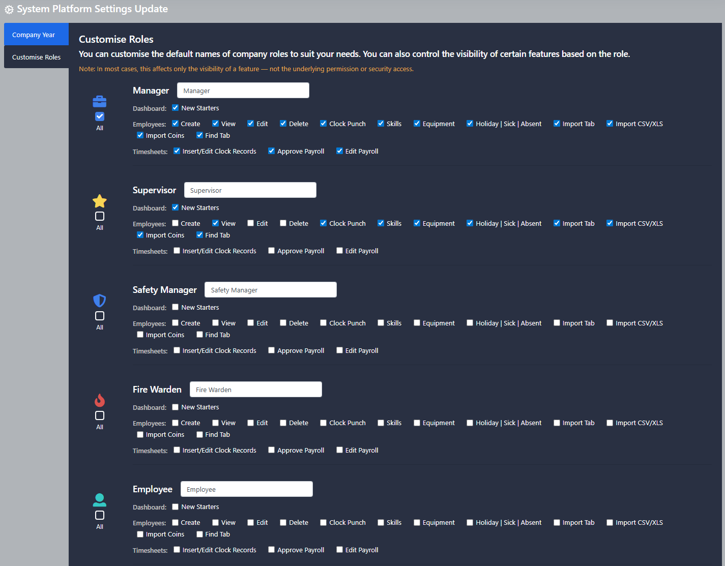 Customise Roles - You can now edit the user roles within the system. Customisable options include editing the role name and assigning role permissions. This function is only available for the super admin account.