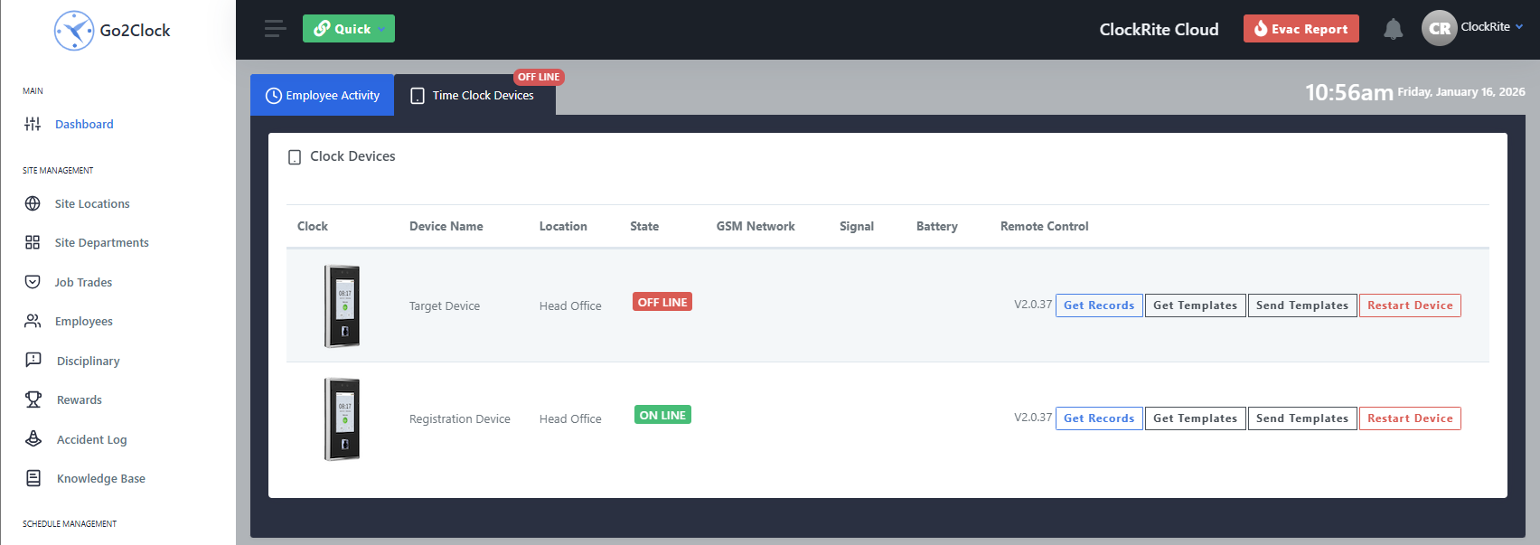 Dashboard Remote Controls - We have added the ability for Full and Limited Dashboard users to Send Templates to the clock from the dashboard. This can be turned on/off for each role by the Super Admin Account under the role customisation settings.