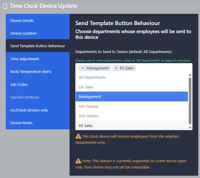 Limit Sending Employees by Department - You can now specify which employees are uploaded to a clock device. Within the device setup you can specify the departments that should be uploaded to the device when clicking the send templates button.