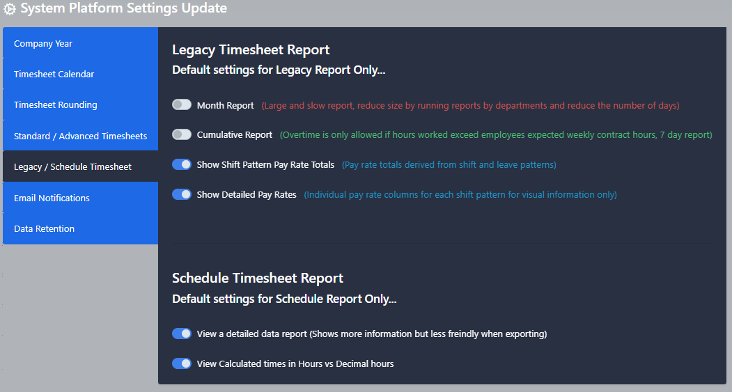 Legacy Report Default Settings - We have added the option to set default settings for the legacy report. These settings can be changed within the system settings tab. This will allow you to ensure the report is run with the correct settings each time.
