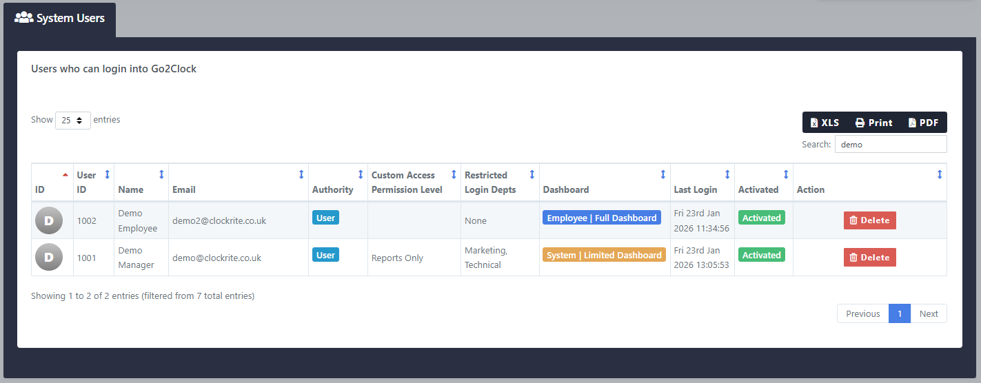 System Users - The system users page has been updated to include details on the custom dashboard level and departments users have been given access to.