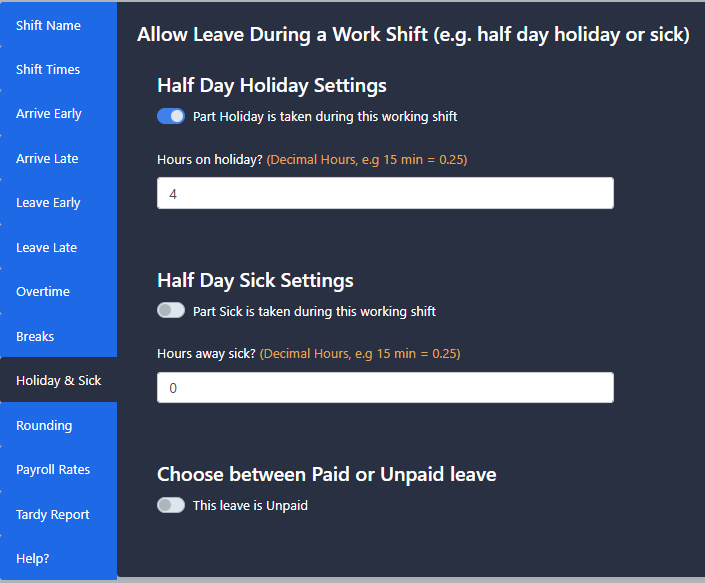 i. Holiday or Sick Toggle(b) - Allows for the absence to be assigned as holiday or sick.